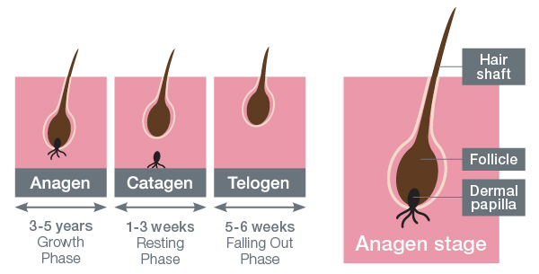 All body & facial hair goes through 3 distinct phases of growth; Anagen, Catagen & Telogen. At any time, 85% of your hair is in the anagen phase (active growth) which where you get best results from a laser hair removal treatment. This is because the follicle (dermal papilla) is closest to the skins surface. The laser beam targets the follicle, heats it & destroys the hair.